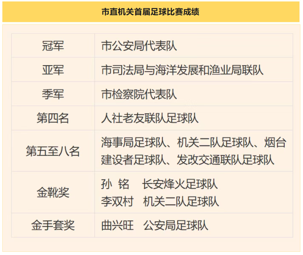 11月13日下午,市直机关首届足球比赛在烟台市体育公园足球场圆满落幕。经过11个比赛日、36场激烈角逐,市公安局代表队、市司法局与海洋发展和渔业局联队、市检察院代表队斩获本届足球比赛前三名。市委常委、秘书长于锋为获奖队颁奖。闭幕式同时开展了健身气功八段锦集中展演,10个单位的100余名健身爱好者参加。